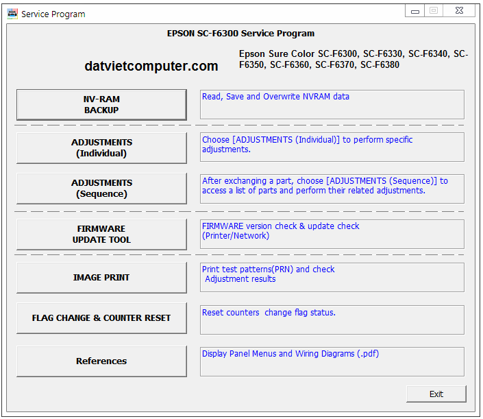 This Epson Sure Color SC-F6300 series adjustment program can be used under Windows XP, 7, 8, 10 with USB connection only.