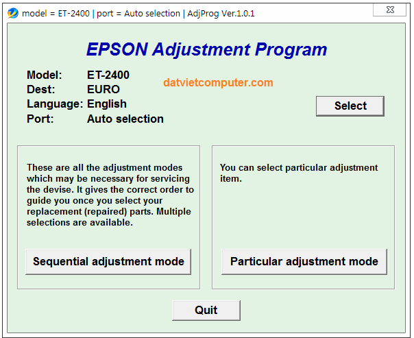 Tool reset Epson ET-2400 Service Adjustment Program — is a original (utility) program for the specified printer models, the program allows you to reset the waste ink pad counter, prescribe the print head ID, do printer initialization and other functions